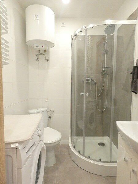Łazienka z WC: kabina prysznicowa, umywalka, pralka, bojler