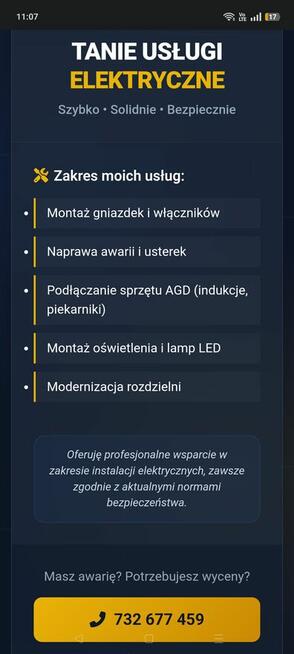 TANIE USŁUGI ELEKTRYCZNE Telefon: 732-677-459 Oferuję profesjonalne wsparcie w zakresie instalacji ...