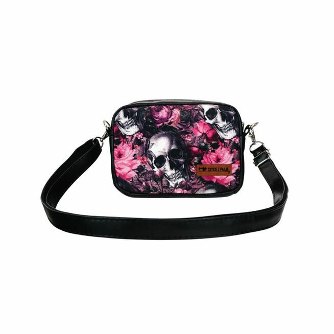 Czarna mini torebka box z motywem czaszek i kwiatów Jeśli szukasz dodatku, który łączy elegancję z wyrazistym stylem, ...