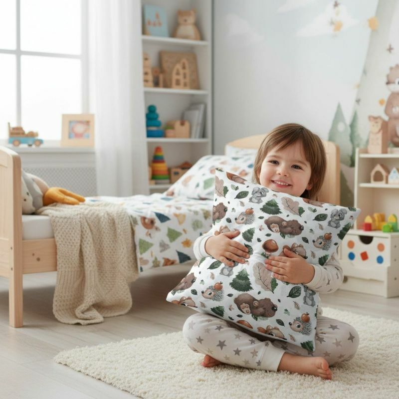 Leśna poszewka z jeżykiem i misiem – naturalny akcent w dziecięcym pokojuWprowadź do wnętrza dziecięcego pokoju odrobinę natury i przytulności dzięki bawełnianej poszewce na poduszkę z motywem jeżyka i misia. Uroczy wzór przedstawiający leśne zwierzątka – jeża, misia i ich przyjaciół – pobudza dziecięcą wyobraźnię i nadaje wnętrzu ciepły, przyjazny charakter. To doskonały wybór dla rodziców, którzy szukają nietuzinkowych dodatków dekoracyjnych łączących estetykę z komfortem.