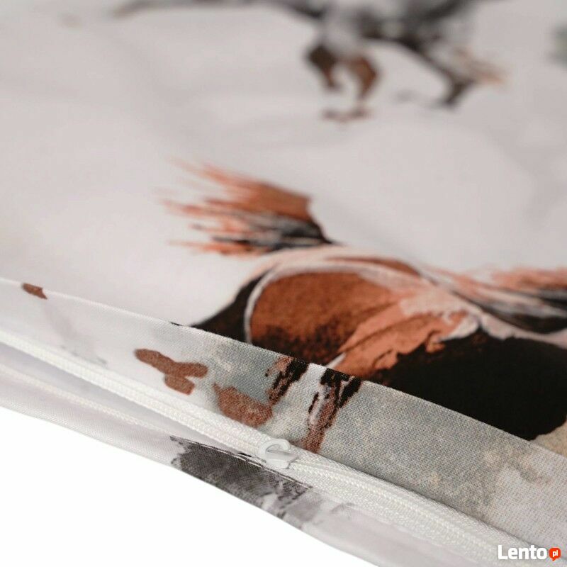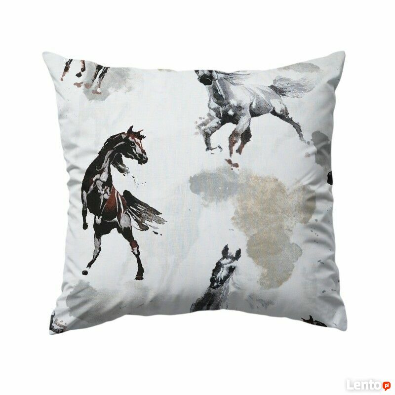 Bawełniana poszewka z akwarelowym motywem koni – 40x40 cmPoszewka dekoracyjna 40x40 z motywem koni to wyjątkowy element wystroju wnętrz, inspirowany malarstwem akwarelowym i naturą. Przedstawia galopujące konie w artystycznej, dynamicznej formie – z subtelnymi pociągnięciami pędzla i pięknym zestawieniem kolorów: szarości, brązów i beżów. Idealnie wkomponuje się w styl boho, rustykalny, vintage czy artystyczny minimalizm, podkreślając charakter pomieszczenia. Dzięki jasnemu tłu i szlachetnej palecie barw, poszewka dodaje elegancji i harmonii każdemu wnętrzu.