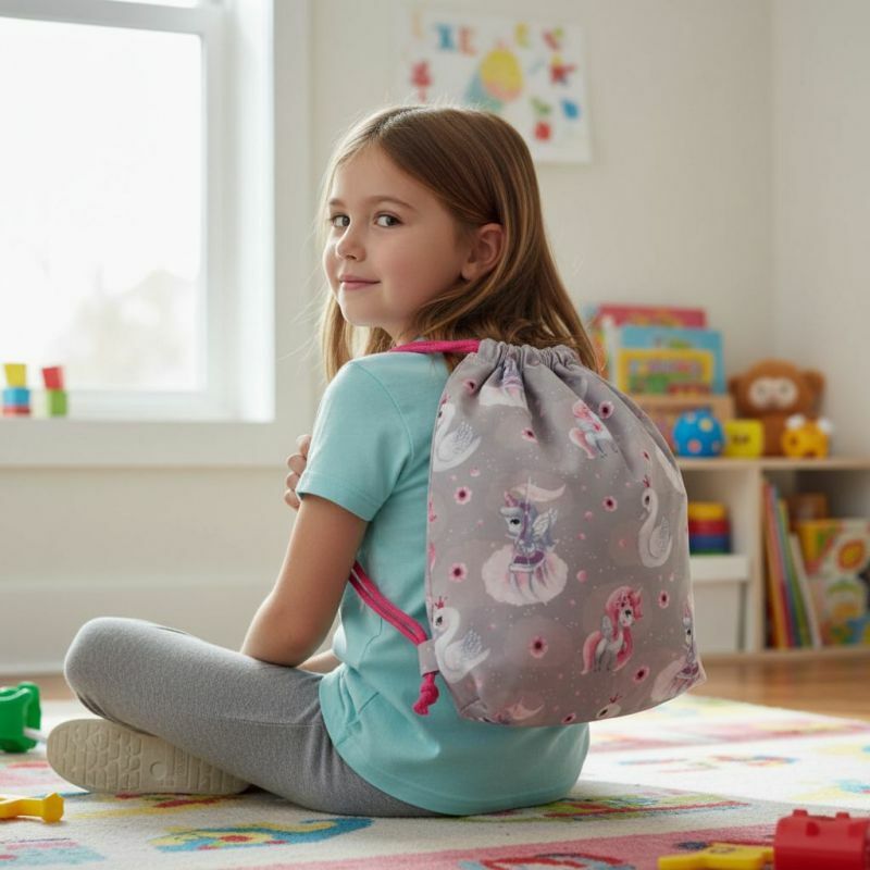 Bawełniany worek do przedszkola z motywem jednorożców i łabędziBawełniany worek do przedszkola „Jednorożce i Łabędzie” to lekki i praktyczny plecak dla dzieci, które lubią delikatne, bajkowe motywy. Wykonany z naturalnej bawełny, jest miękki, przewiewny i wygodny w codziennym użytkowaniu. Dzięki wymiarom 45 × 35 cm bez problemu mieści zeszyty, książki i drobiazgi w formacie A4 – idealny do przedszkola, szkoły lub na zajęcia dodatkowe.