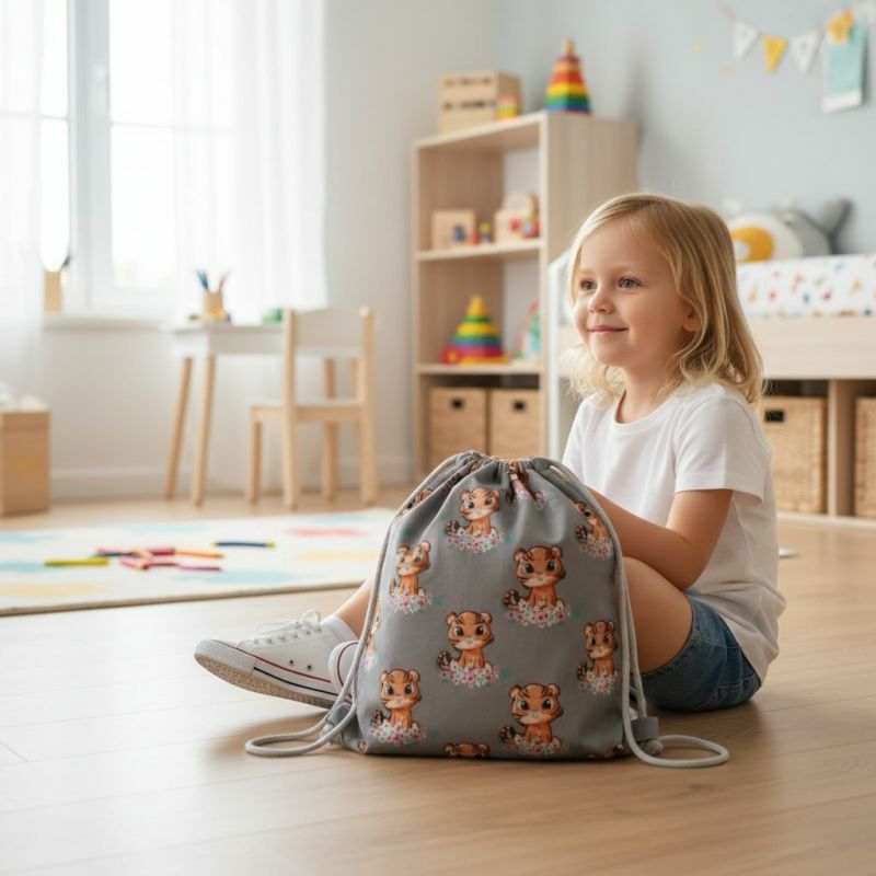Wzór z małymi tygryskami na stonowanym, szarym tle nadaje workowi ciepły, dziecięcy charakter. Każdy egzemplarz to produkt handmade z Polski – uszyty w małej pracowni z dbałością o detale i trwałość. Worek zamykany jest na bawełniany sznurek, który pełni również funkcję szelek – jest lekki, wygodny i prosty w użytkowaniu.