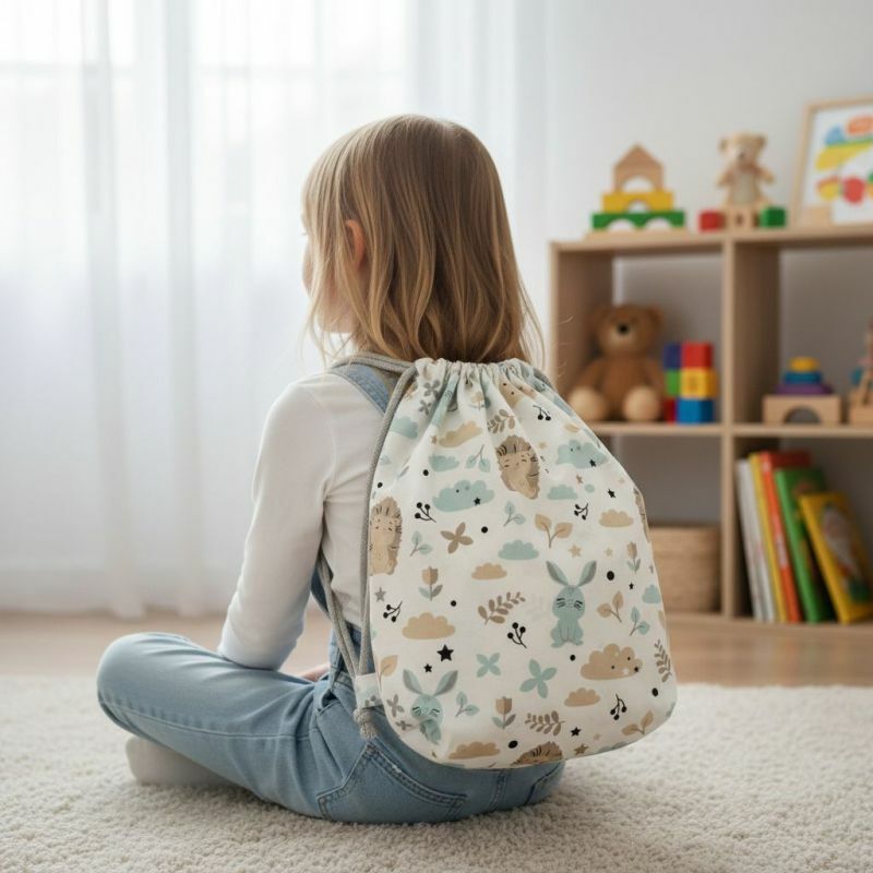 Subtelny wzór z jeżykami, zajączkami i roślinnymi elementami w pastelowych kolorach nadaje workowi spokojny, dziecięcy charakter. Każdy egzemplarz to produkt handmade – uszyty w polskiej pracowni z dbałością o detale i trwałość. Worek zamykany jest na bawełniany sznurek, który pełni również funkcję szelek – jest lekki, wygodny i prosty w użytkowaniu.