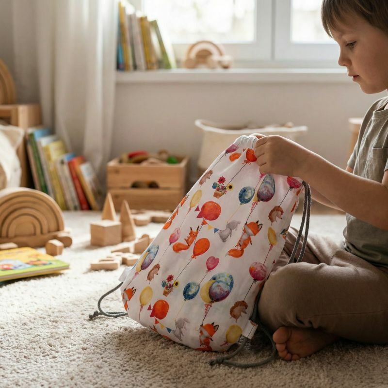 Bawełniany worek dziecięcy z liskami i balonikamiBawełniany worek do przedszkola z motywem wesołych lisków i kolorowych baloników to lekki i wygodny plecak dla dziecka. Pastelowa kolorystyka i przyjazny wzór sprawiają, że doskonale pasuje do codziennej przedszkolnej wyprawki.