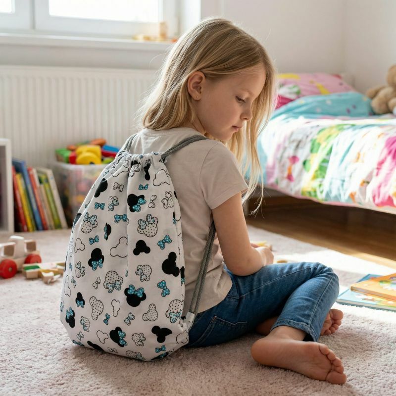 Worek można nosić na plecach lub w ręku. Jest lekki, pojemny i łatwy do przechowywania, dlatego idealnie nadaje się na ubrania na zmianę, kapcie lub drobiazgi potrzebne dziecku w ciągu dnia.