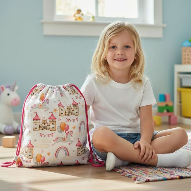 Wzór z zamkiem, jednorożcami i tęczą tworzy radosny, bajkowy klimat, który dzieci uwielbiają. Każdy egzemplarz to produkt handmade – uszyty w polskiej pracowni z dbałością o detale i trwałość. Worek zamykany jest na bawełniany sznurek, który pełni również funkcję szelek – jest lekki, wygodny i prosty w użytkowaniu.