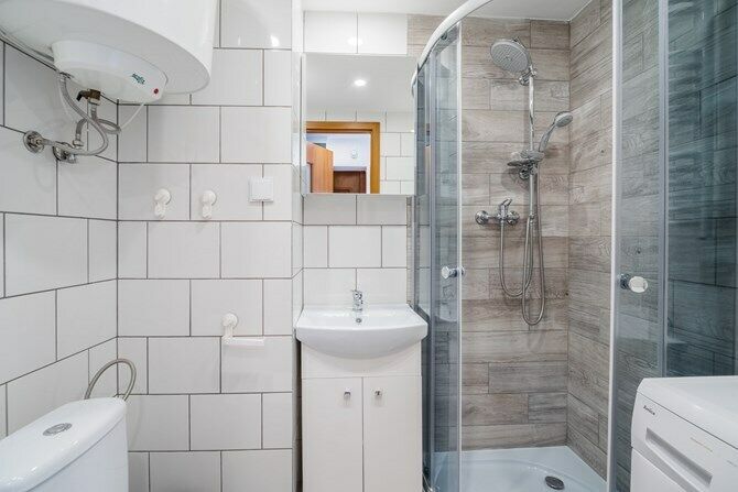 Łazienka: kabina prysznicowa, pralka, umywalka z szafką