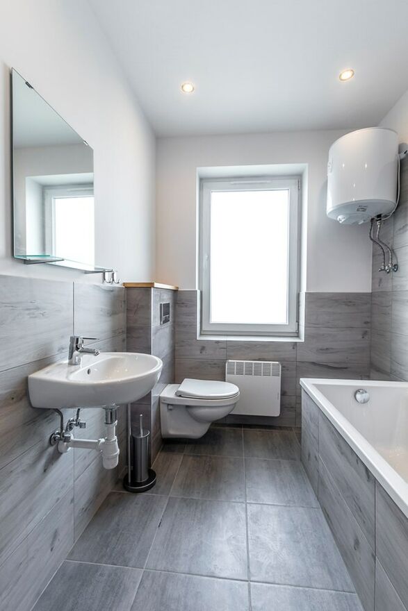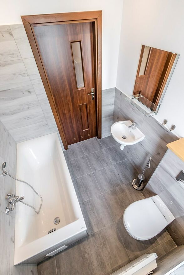 Łazienka: wanna, umywalka, pralka, bojler elektryczny.