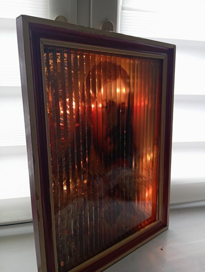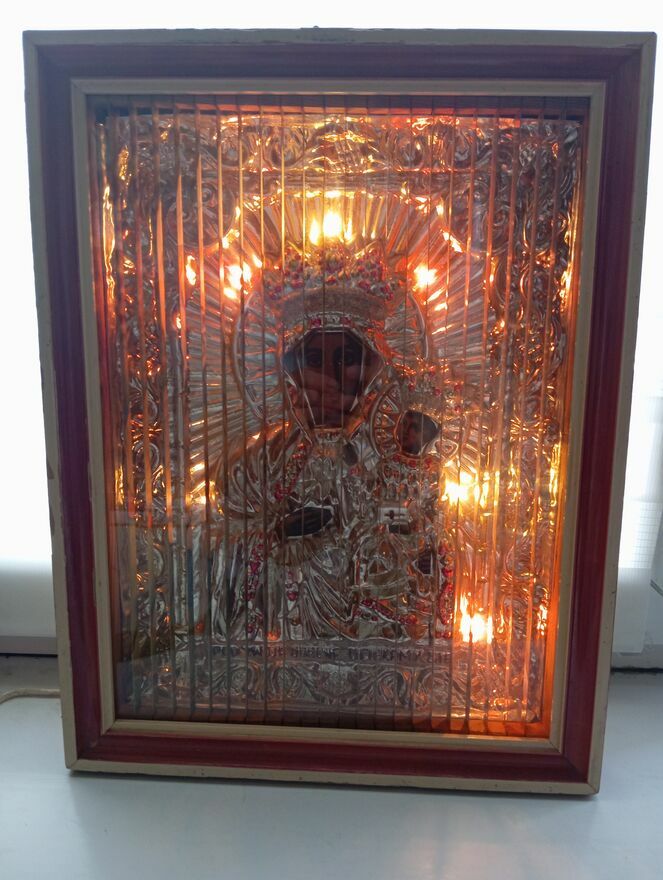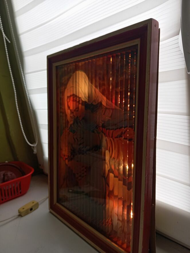 Dziadkowa pamiątka Matki Boskiej z Dzieciątkiem Jezus z oświetleniem 3D.Stan dobry lekko draśnięty znakiem czasu.
