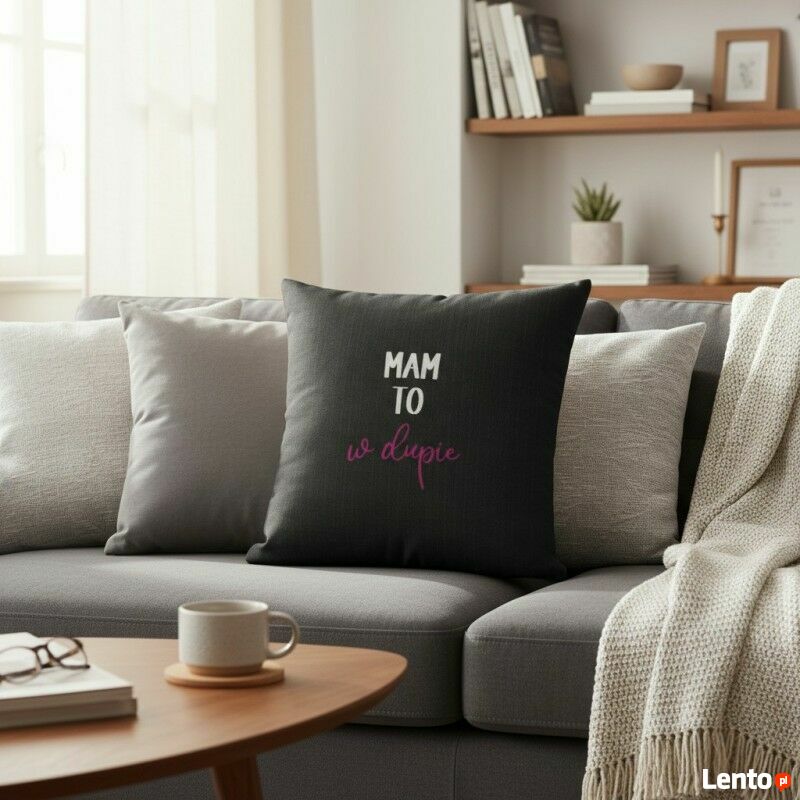 Wyrazisty napis „Mam To w *” na tle czerni lub grafitu, z różowym akcentem, przyciąga wzrok i doskonale oddaje luźne podejście do życia. Poduszka jest dostępna w wielu wersjach kolorystycznych tyłu – od klasycznych odcieni po modne pastele – dzięki czemu bez trudu dopasujesz ją do swojego wnętrza. To idealny wybór dla osób, które chcą wyrazić siebie w niebanalny sposób lub poszukują oryginalnego prezentu z humorem.