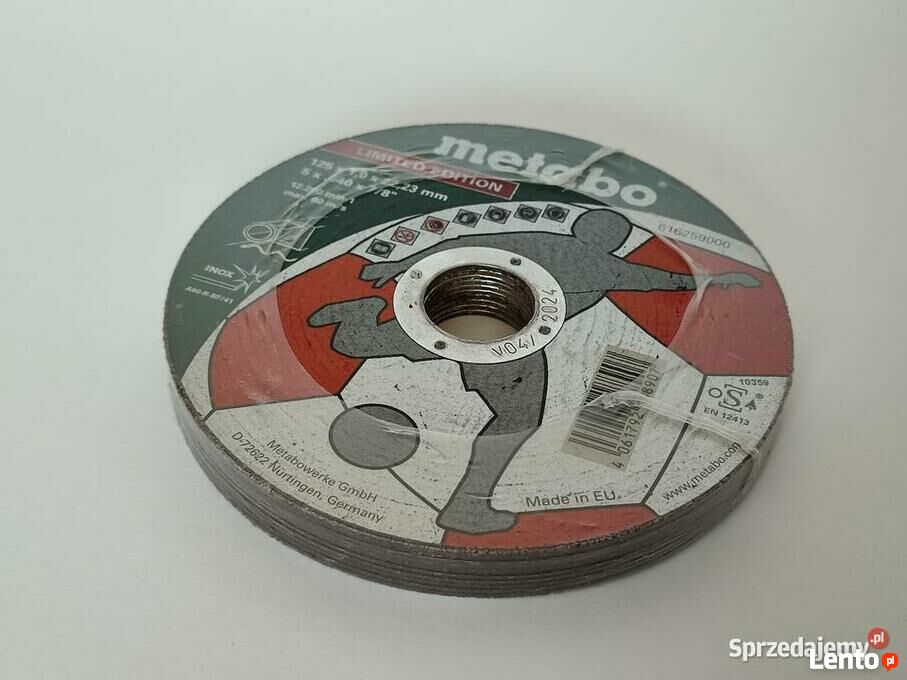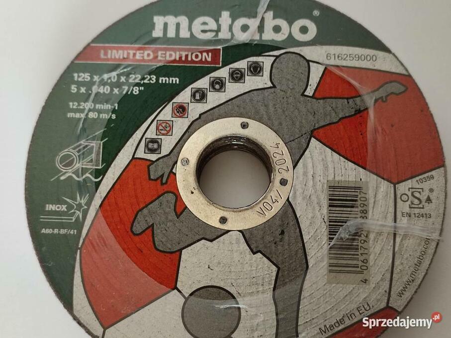 TYLKO WYSYŁKA: *Poczta Polska list ekonomiczny 6,50 list priorytetowy 8.50 *Paczkomat 15-18złMETABO TARCZA TNĄCA INOX DO STALI 22,23x125mm Cechy produktu: Uniwersalna tarcza do obróbki stali / stali nierdzewnej. Niska zawartość żelaza, siarki i chloru (Fe + S + Cl <= 0,1%) Dobra wydajność skrawania przy dobrej trwałości narzędzia, niskim zużyciu materiału, energooszczędności, niewielkim obciążeniu maszyny Tarcza tnąca z certyfikatem OSA Dane techniczne: Średnica tarczy 125 mm Średnica otworu 22.23 mm Grubość 1 mm Kształt prosta Maks. prędk. obrot. 12200 obr./min.