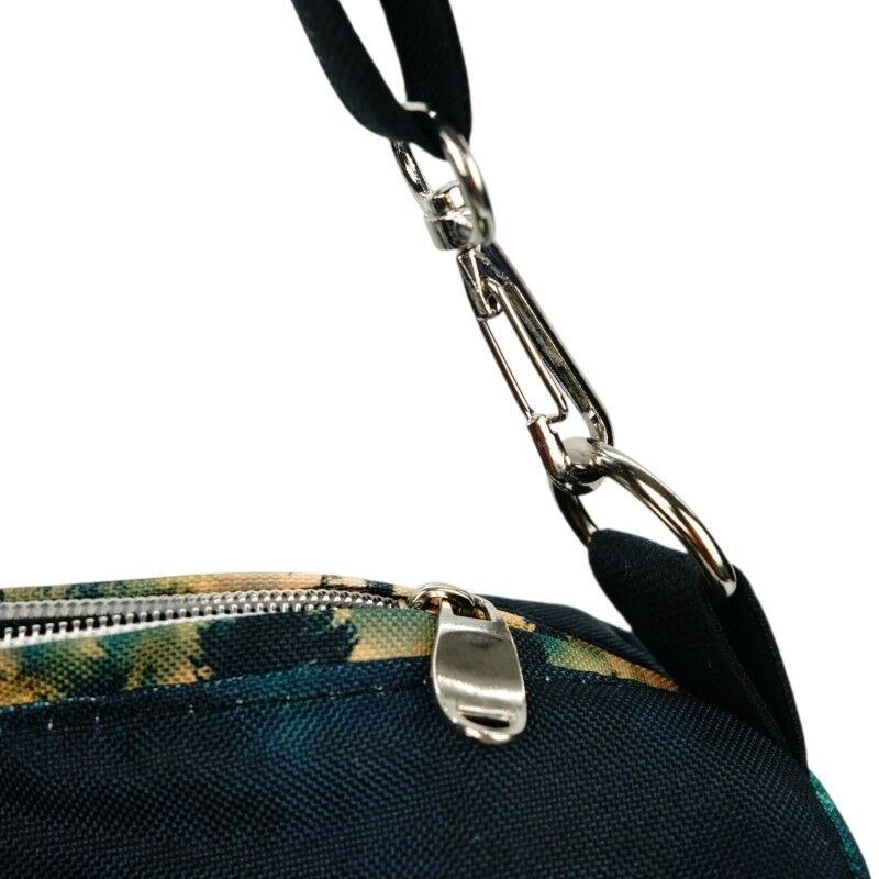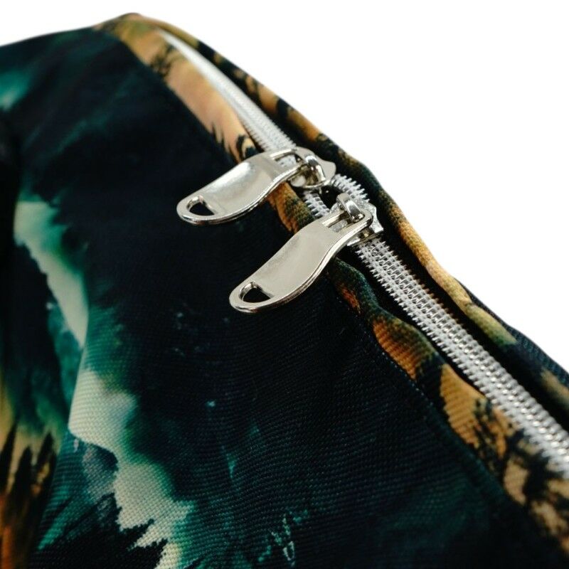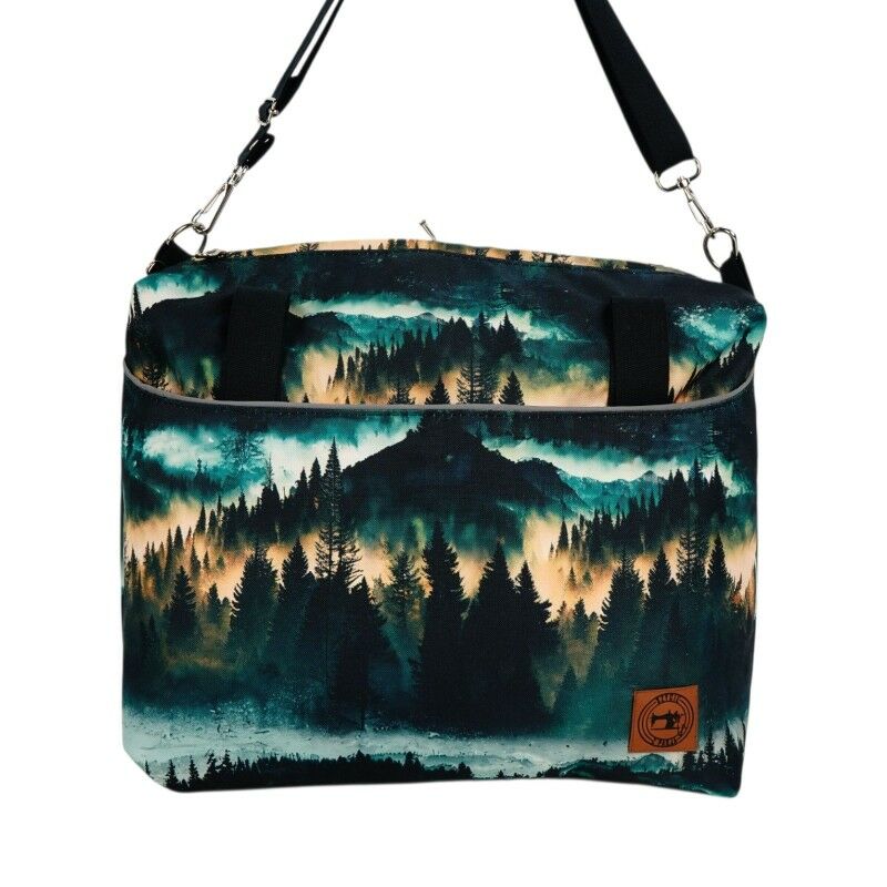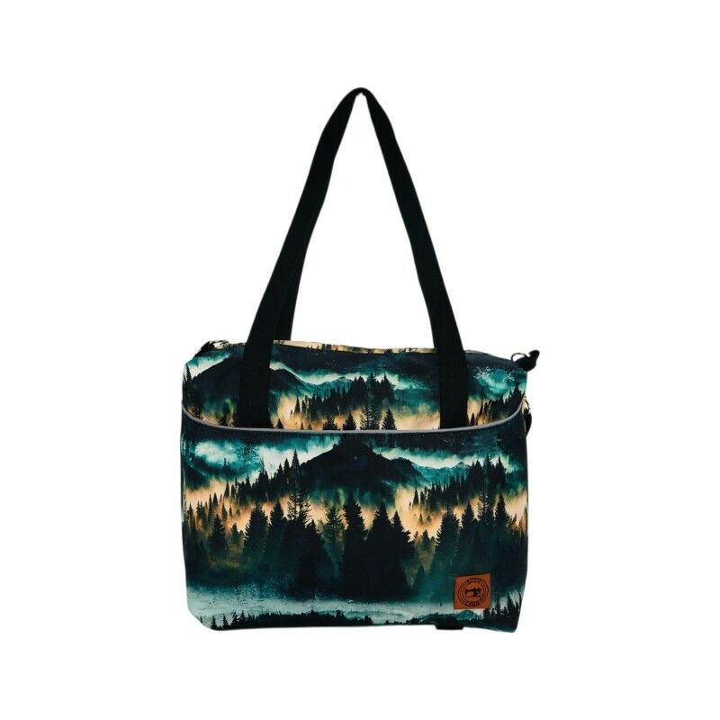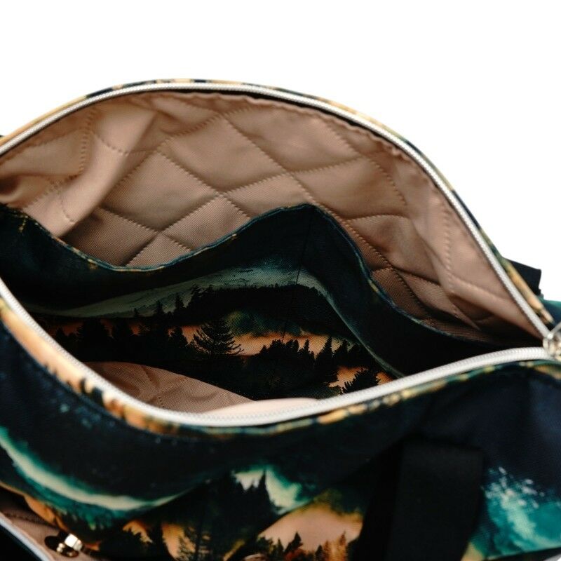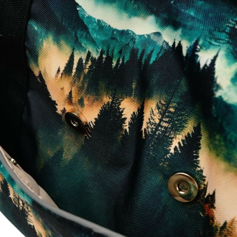 Wykonany z wodoodpornego poliestru jest lekki, wytrzymały i łatwy w czyszczeniu. Wnętrze zawiera praktyczne kieszonki – wewnętrzną i zewnętrzną – a całość zamykana jest na solidny zamek. Motyw malowniczych gór i lasu w głębokich, naturalnych barwach przyciąga wzrok i dodaje charakteru każdej stylizacji.