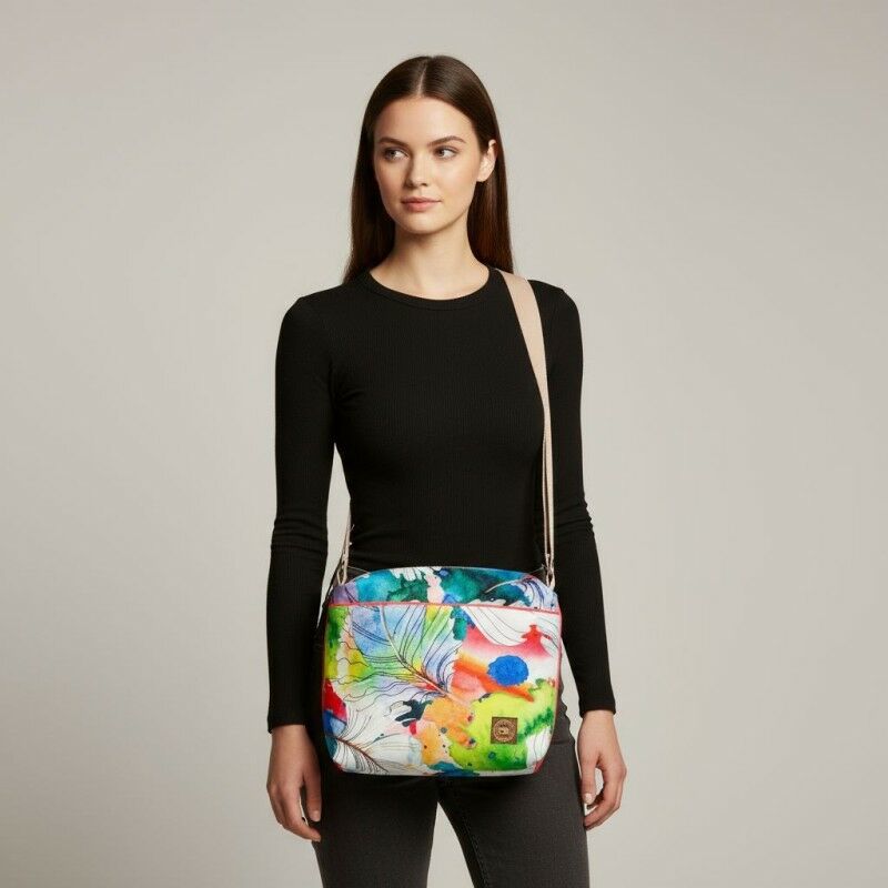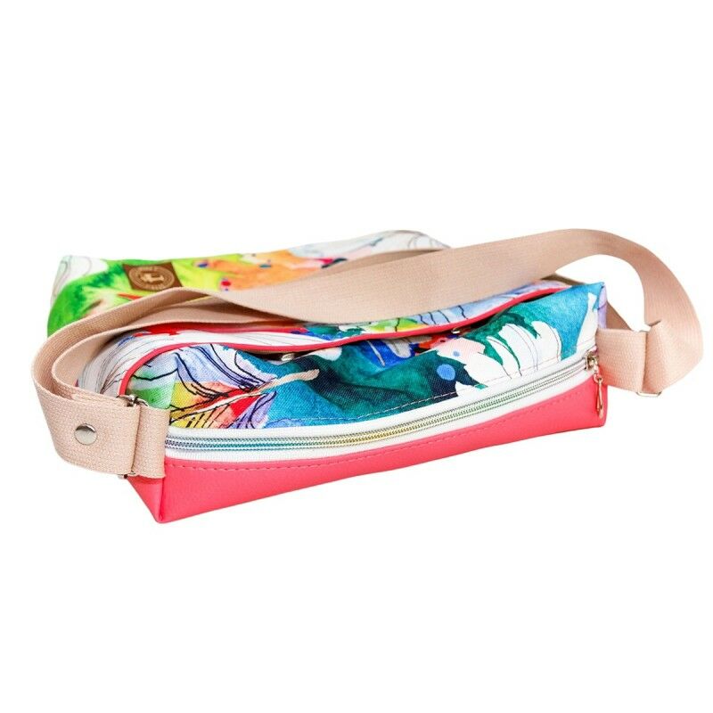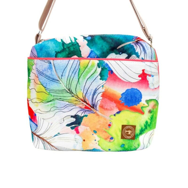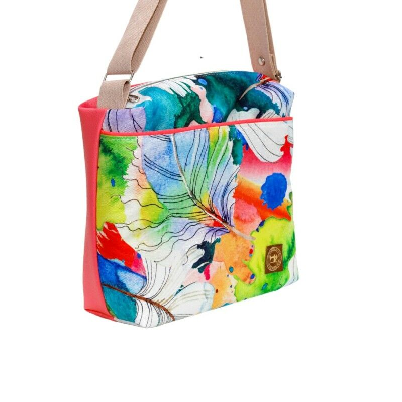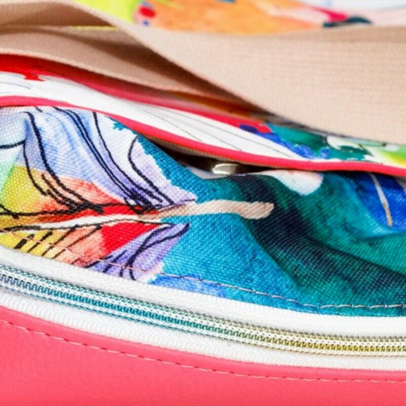 Torebka z Motywem Piórek i Różową Ekoskórą – Kolorowy Akcent HandmadeWyjątkowa torebka handmade, która łączy różową ekoskórę z tkaniną w barwny motyw piórek. Wzór inspirowany akwarelowym malarstwem przyciąga uwagę intensywnymi kolorami i artystycznym charakterem. To idealny dodatek dla osób, które lubią wyrażać siebie poprzez modę.