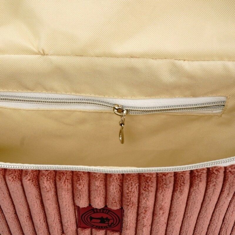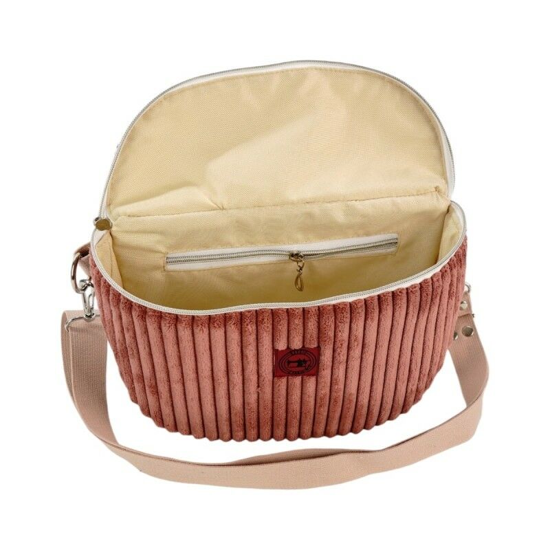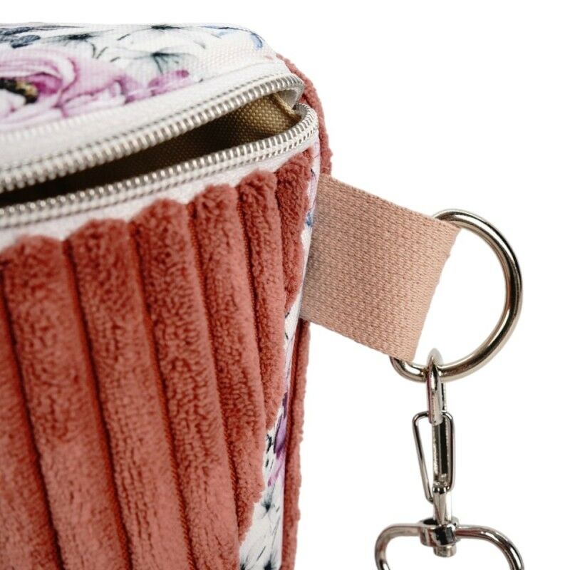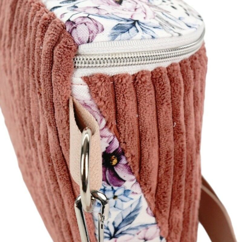 Torebka została wykonana z połączenia miękkiego sztruksu w odcieniu brudnego różu oraz wodoodpornego materiału poliestrowego z motywem pastelowych kwiatów. Całość tworzy subtelny, dziewczęcy i elegancki design, idealny zarówno na co dzień, jak i na specjalne okazje.