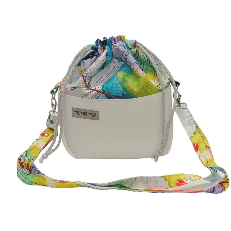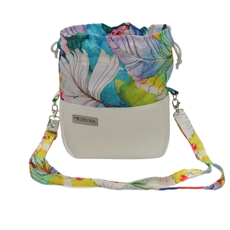 Biała torebka sakiewka z motywem kolorowych liści – handmadeSubtelna i pełna świeżości mała torebka w kształcie sakiewki, uszyta z połączenia białej ekoskóry i barwnej tkaniny z motywem liści. Lekki, akwarelowy wzór przyciąga wzrok i nadaje całości wiosennego, radosnego charakteru. Idealna dla kobiet, które lubią jasne, eleganckie dodatki z nutą koloru.