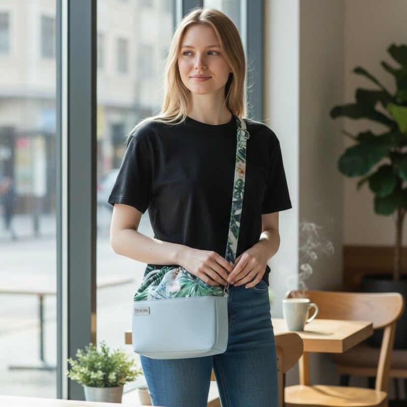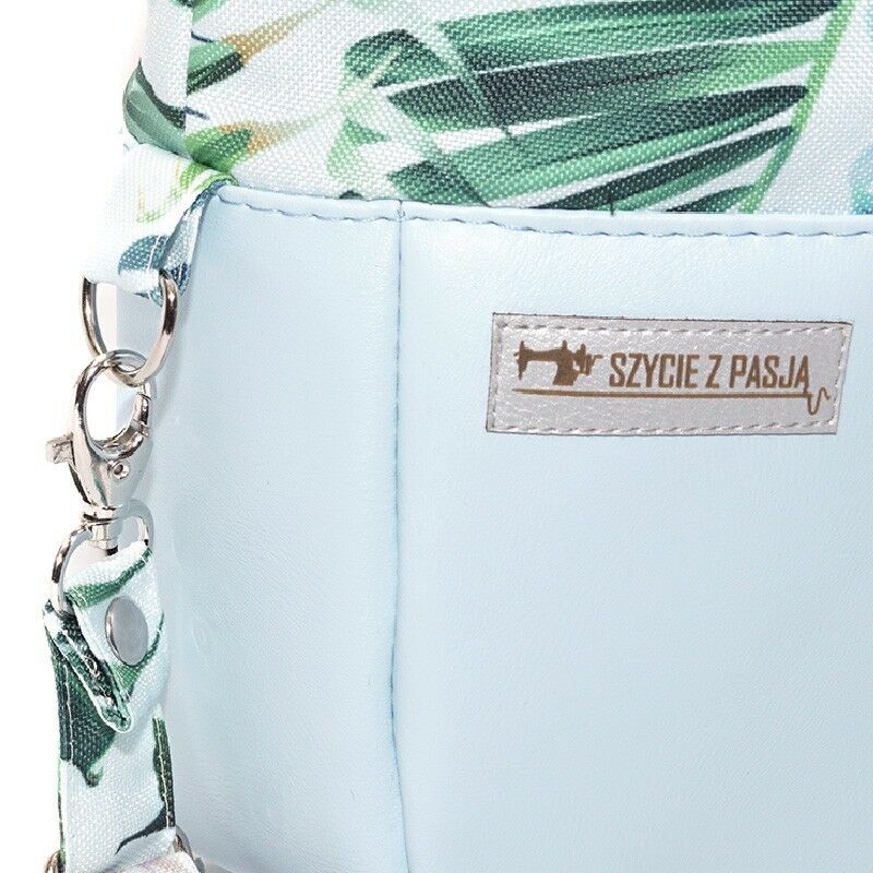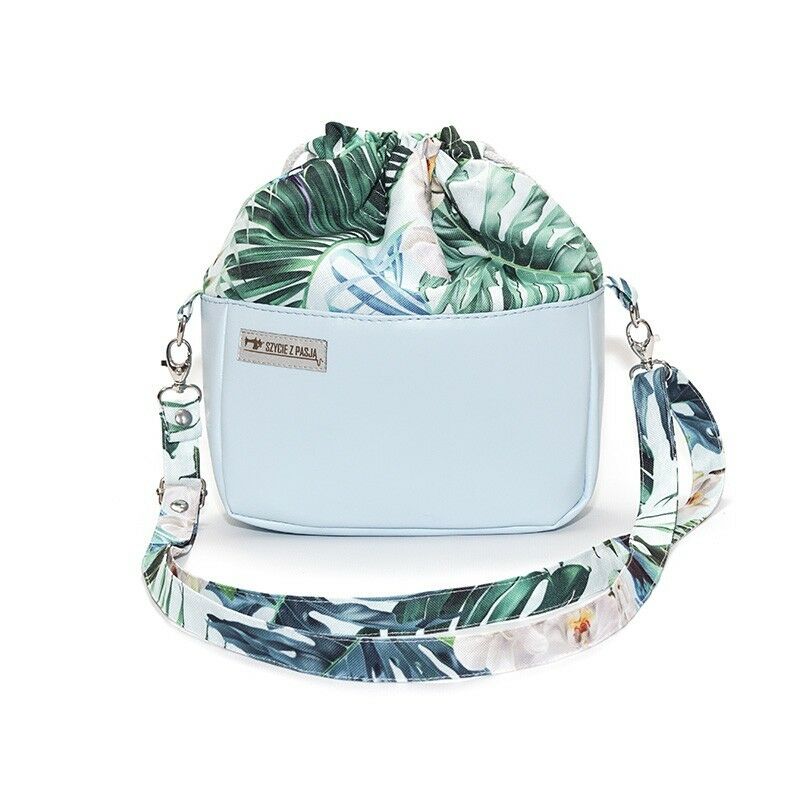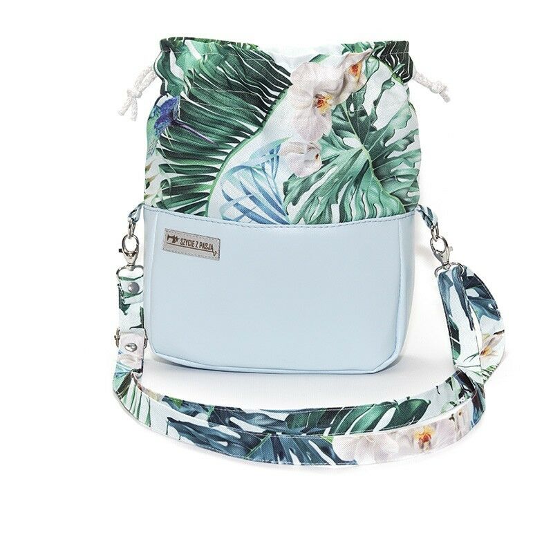 Błękitna torebka sakiewka z motywem tropikalnych liści i orchidei – handmadeElegancka torebka sakiewka w delikatnym błękicie inspirowana egzotyczną naturą. Gładka ekoskóra w połączeniu z tkaniną przedstawiającą zielone liście palm i białe orchidee tworzy lekką, wakacyjną kompozycję. To idealny dodatek dla kobiet, które lubią połączenie świeżości i stylu.