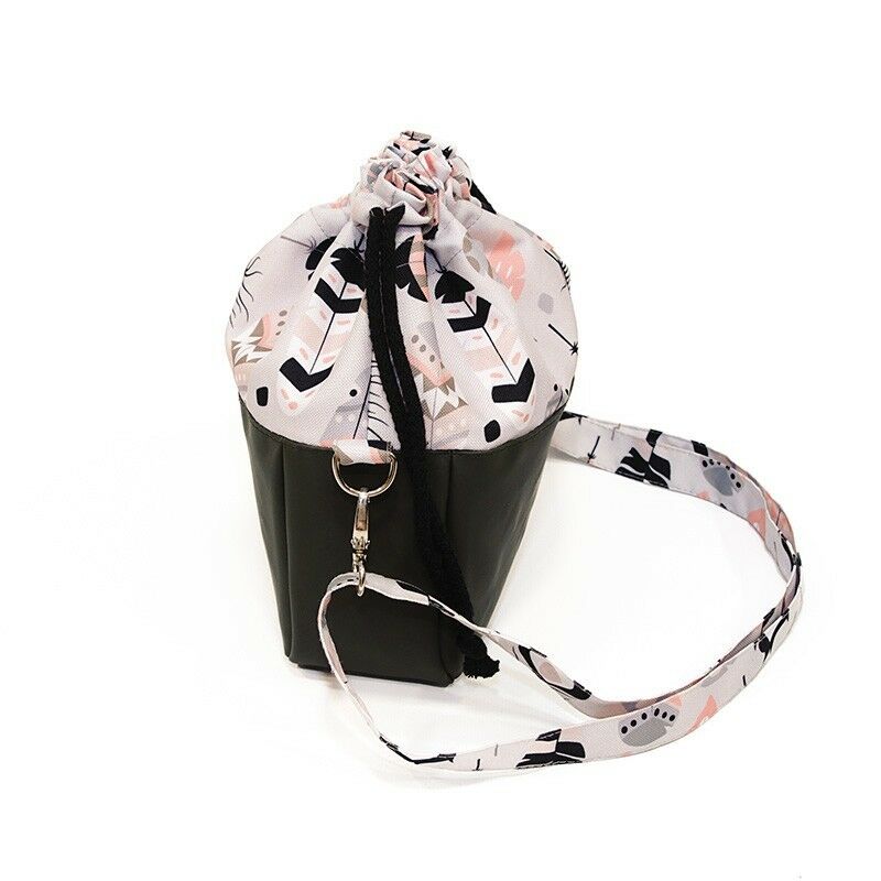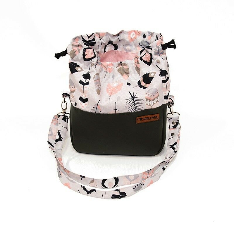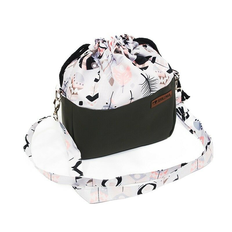 Ciemnozielona torebka sakiewka z motywem piórek – handmadeElegancka mała torebka w kształcie sakiewki, wykonana z połączenia ciemnozielonej ekoskóry i tkaniny poliestrowej z delikatnym motywem piórek na jasnoszarym tle. Subtelne połączenie barw sprawia, że torebka ma lekki, naturalny wygląd i pasuje do wielu stylizacji – od codziennych po bardziej eleganckie.