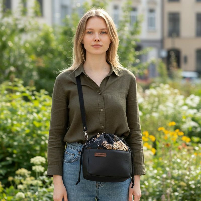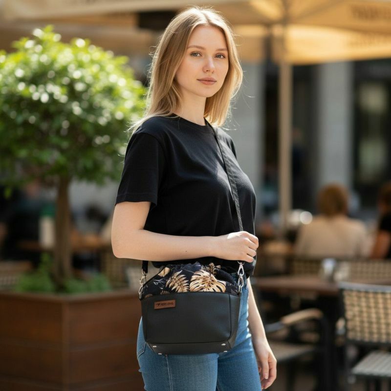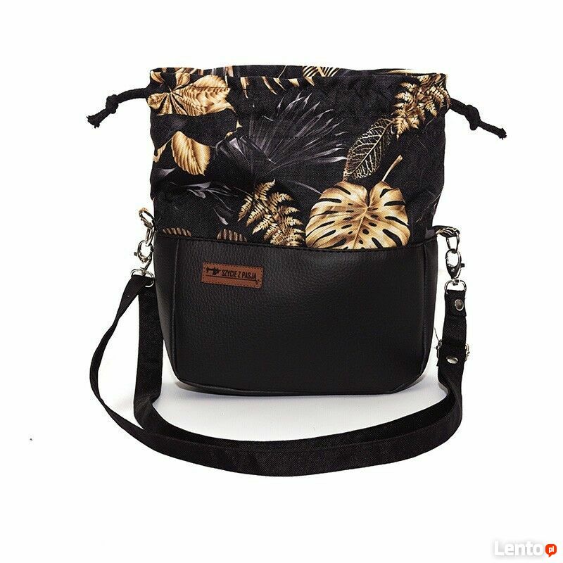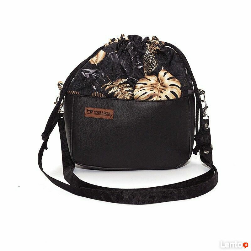 Czarna torebka sakiewka z motywem Złoty Monster – handmadeStylowa torebka w kształcie sakiewki, wykonana z połączenia czarnej ekoskóry i tkaniny z eleganckim motywem złotych liści monstera. To model, który łączy subtelną klasykę z odrobiną blasku, dodając każdej stylizacji wyjątkowego charakteru.