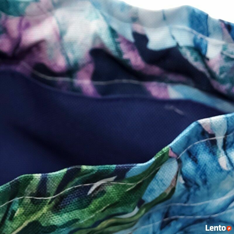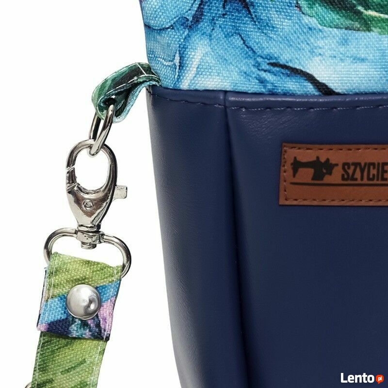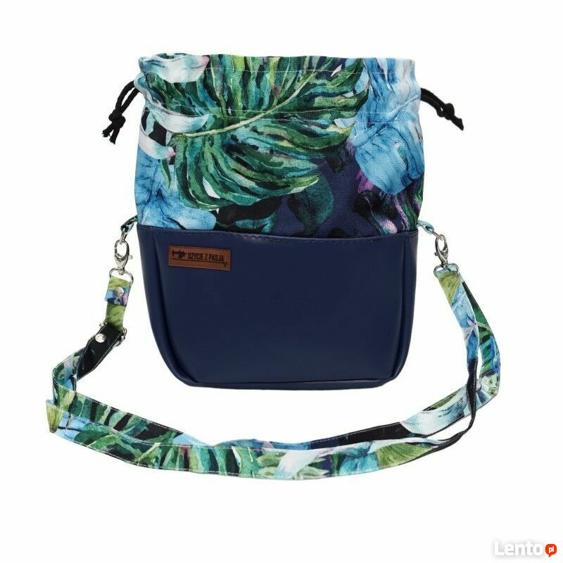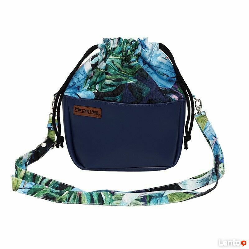 Granatowa torebka sakiewka z motywem tropikalnych liści – handmadeStylowa torebka sakiewka, która łączy elegancję z wakacyjną lekkością. Gładki, granatowy dół z ekoskóry idealnie komponuje się z materiałem w tropikalne liście w odcieniach zieleni, błękitu i różu. Torebka przyciąga wzrok i dodaje świeżości każdej stylizacji.