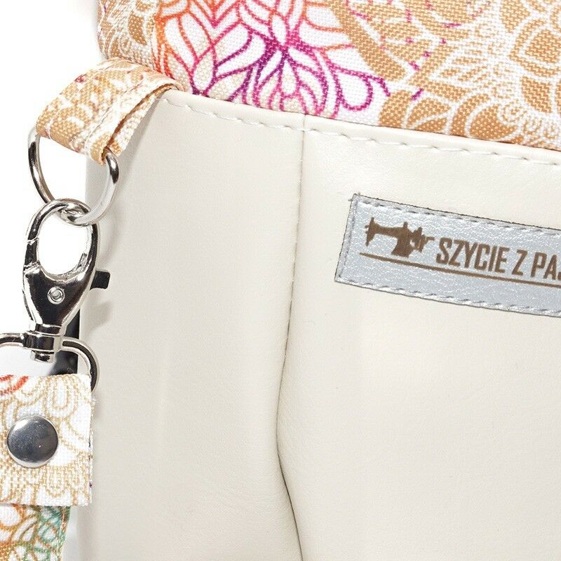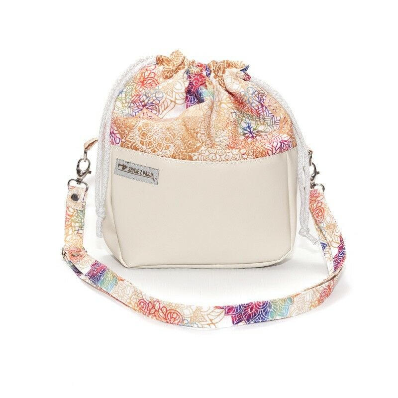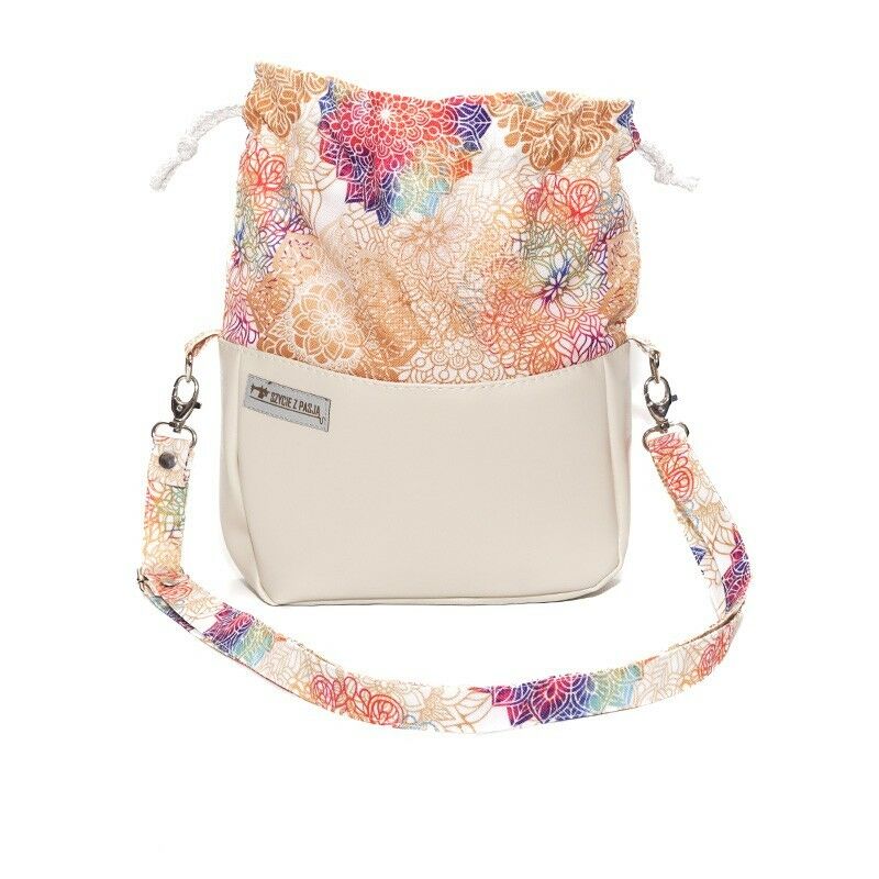 Kremowa torebka sakiewka z motywem mandali – handmadeStylowa i harmonijna torebka w kształcie sakiewki, wykonana z połączenia kremowej ekoskóry i tkaniny z barwnym wzorem mandali. Ciepłe odcienie złota, pomarańczu i różu przeplatają się z chłodnymi tonami błękitu i fioletu, tworząc wyjątkową kompozycję pełną pozytywnej energii.