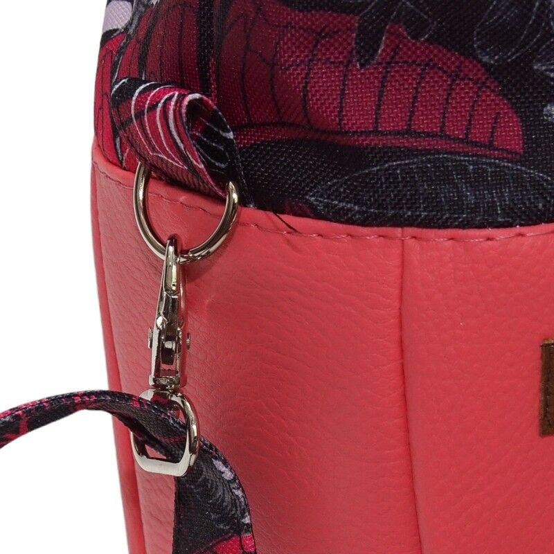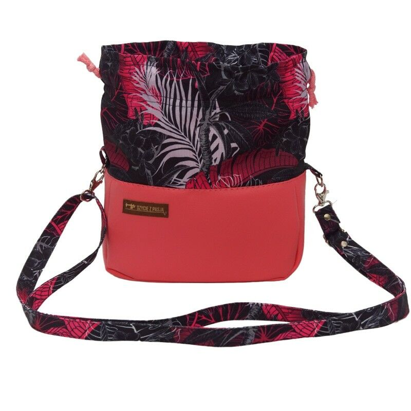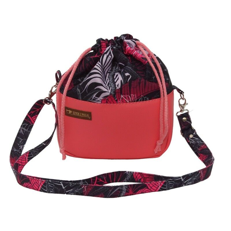 Różowa torebka sakiewka z motywem liści bananowca – handmadePełna energii mała torebka w kształcie sakiewki, uszyta z połączenia różowej ekoskóry i tkaniny poliestrowej z motywem liści bananowca. Ten egzotyczny wzór w odcieniach różu, fioletu i czerni przyciąga wzrok i nadaje torebce wyjątkowego charakteru. To doskonały model dla kobiet, które lubią wyróżniać się dodatkami.