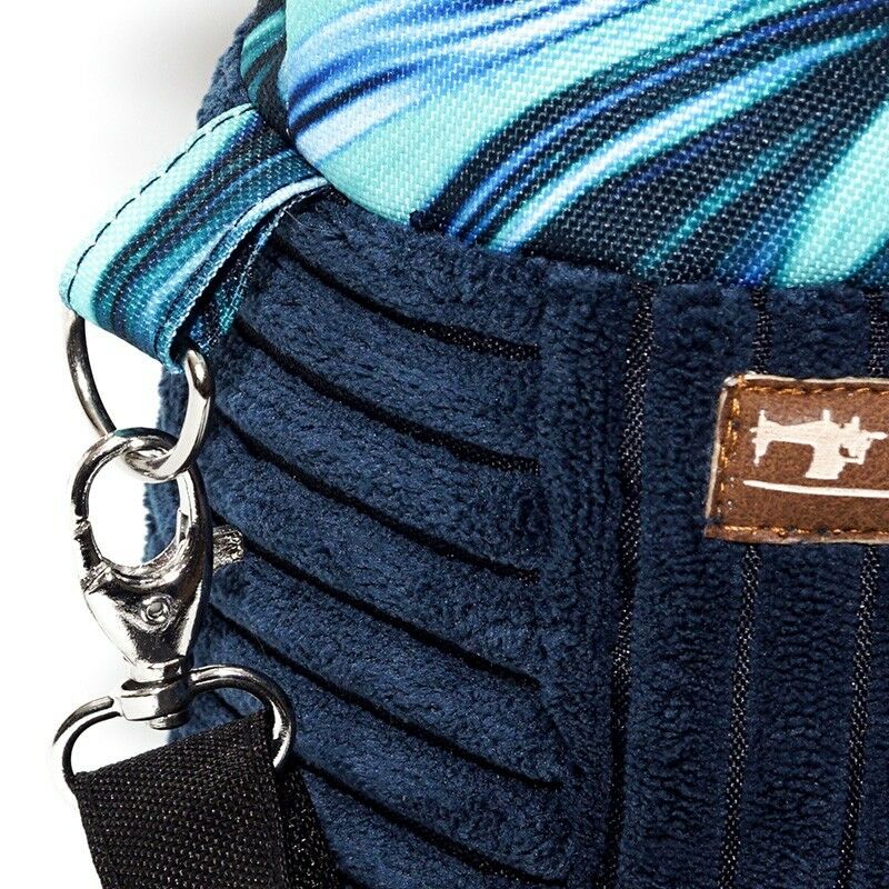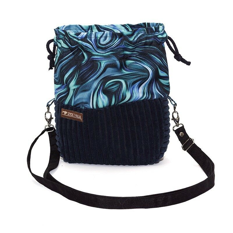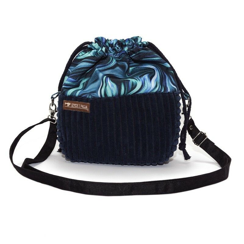 Granatowa torebka sakiewka sztruksowa z motywem Ebru – handmadeWyjątkowa torebka sakiewka handmade stworzona z połączenia miękkiego, prążkowanego sztruksu w kolorze granatowym i tkaniny z artystycznym wzorem Ebru w odcieniach błękitu i turkusu. Inspirujący, abstrakcyjny motyw nadaje jej niepowtarzalny charakter.