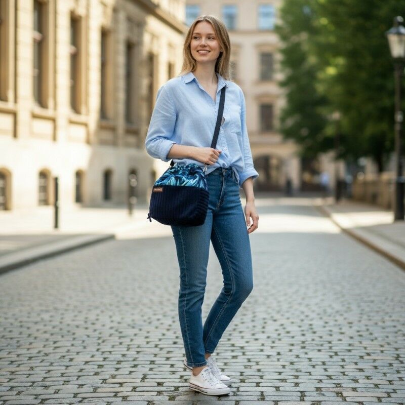 Torebka jest lekka i wygodna, zamykana na sznurek troczek. Regulowany pasek umożliwia dopasowanie długości do sylwetki, dzięki czemu można ją nosić przez ramię lub na ukos. To idealny wybór dla kobiet ceniących oryginalne dodatki handmade.