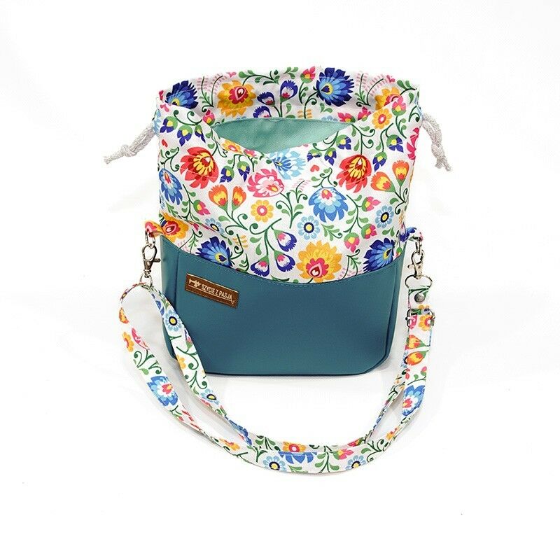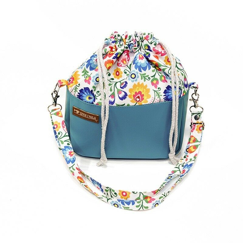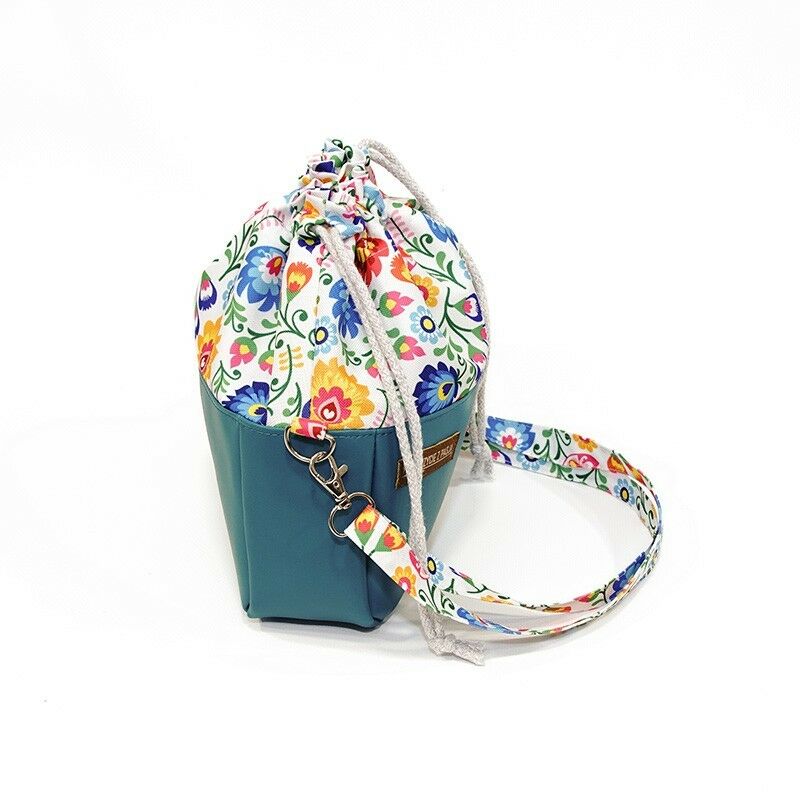 Turkusowa torebka sakiewka z ludowym motywem kwiatów – handmadeKolorowa i pełna uroku mała torebka w kształcie sakiewki, wykonana z połączenia turkusowej ekoskóry oraz tkaniny poliestrowej z motywem ludowych kwiatów. To model, który łączy tradycyjny wzór z nowoczesnym fasonem – idealny dla kobiet, które lubią oryginalne i radosne dodatki.
