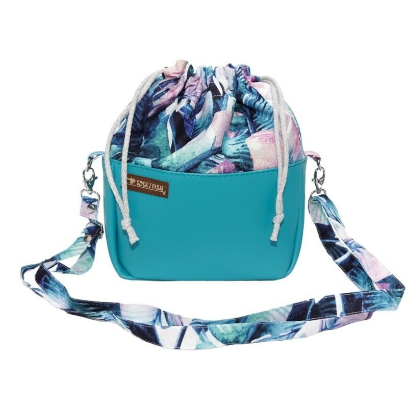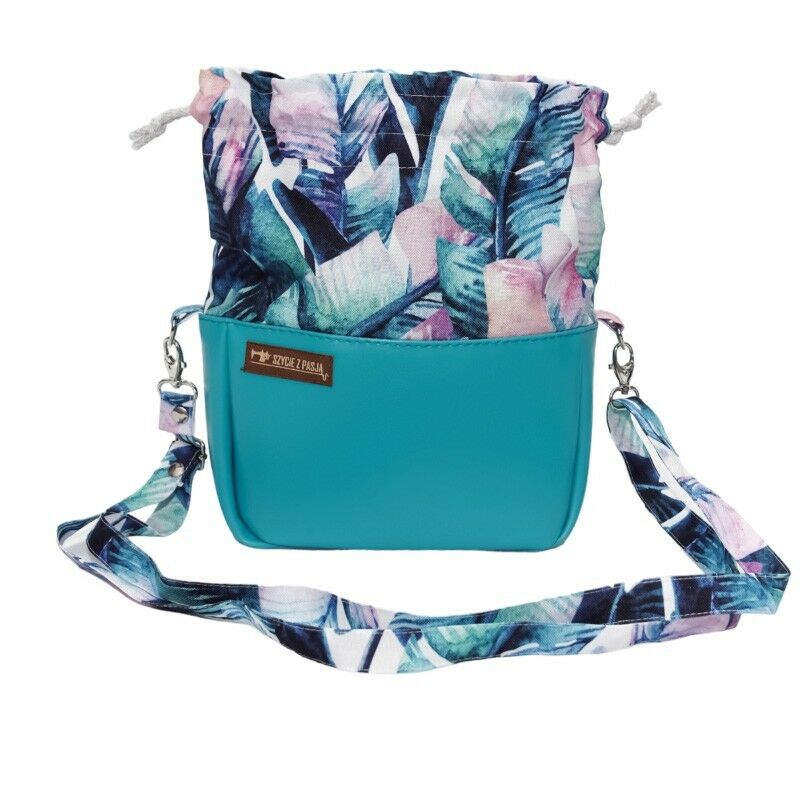 Turkusowa torebka sakiewka z motywem tropikalnych liści – handmadeSoczysta, pełna wakacyjnego klimatu torebka sakiewka, która doda koloru każdej stylizacji. Połączenie gładkiej turkusowej ekoskóry i tkaniny z wzorami tropikalnych liści w odcieniach zieleni, fioletu i różu sprawia, że to model idealny na lato i nie tylko.