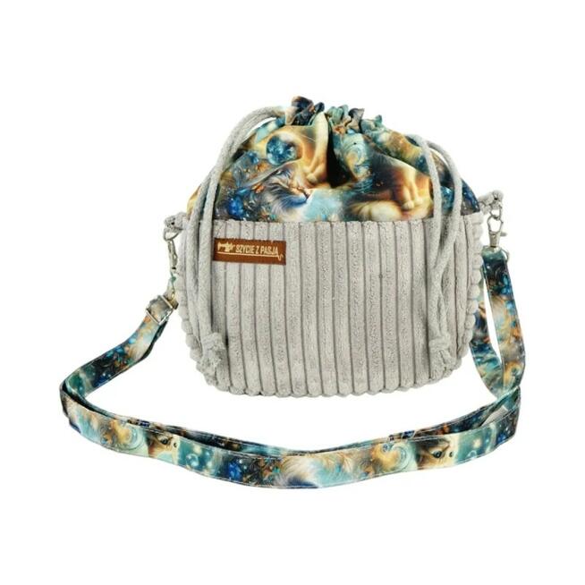 Szara torebka sakiewka z kosmicznym wzorem kotów – wyjątkowy styl handmade Wyjątkowa torebka sakiewka handmade ...