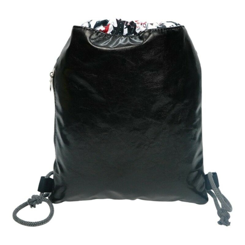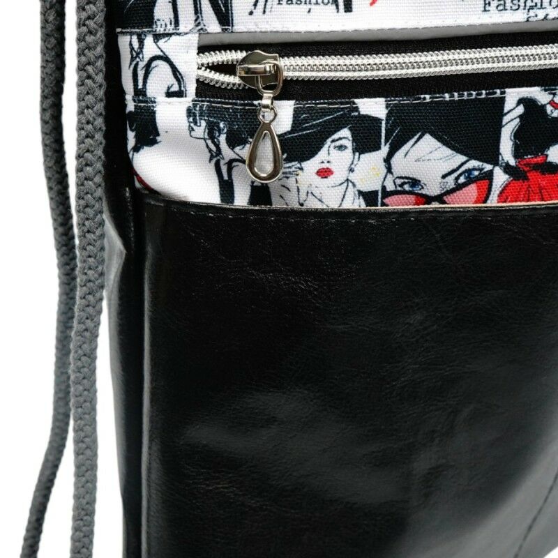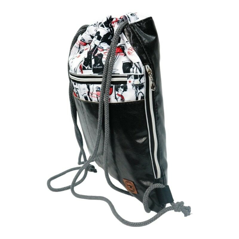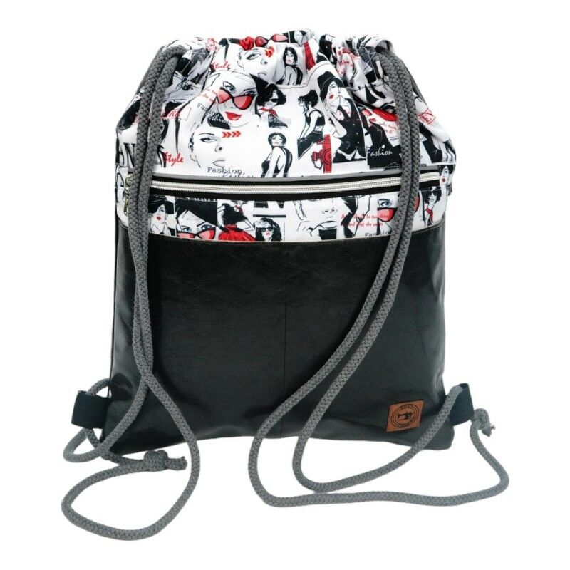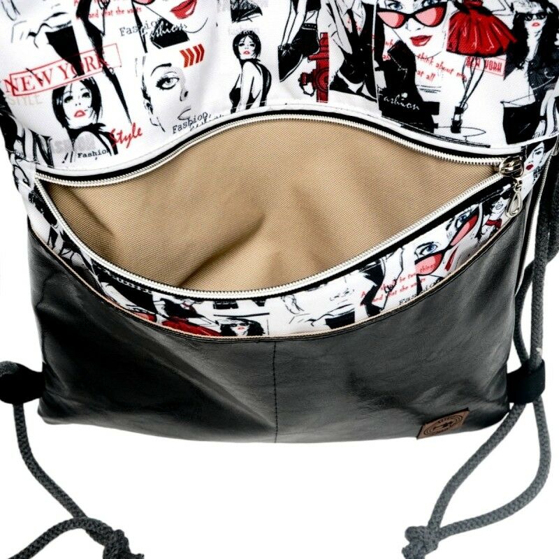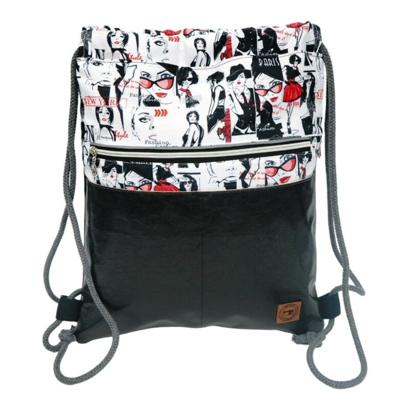 Czarny Worko-Plecak z Motywem Fashion – Handmade z Ukrytą Kieszenią na ZamekNowoczesny worko-plecak handmade, który łączy czarną ekoskórę z tkaniną poliestrową w modny motyw fashion. Stylowy nadruk inspirowany miejskim światem mody i elegancji nadaje mu wyjątkowego charakteru. To idealny model dla osób, które cenią oryginalne dodatki z nutą stylu „fashion street”.