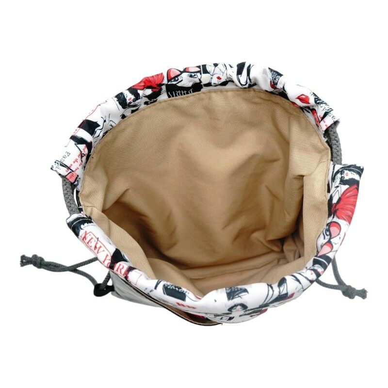 Plecak posiada komorę główną zamykaną na sznurek troczek, dzięki czemu jest lekki i praktyczny. Z przodu znajduje się duża kieszeń przeszyta na pół, tworząca dwie osobne przegródki oraz dodatkowa kieszeń zamykana na zamek. Z boku umieszczono ukrytą kieszeń na zamek, idealną na telefon, klucze lub inne drobiazgi. Szare sznurki dopełniają nowoczesny wygląd plecaka, zapewniając jednocześnie wygodę noszenia.