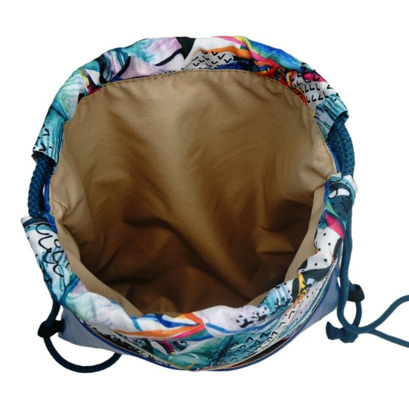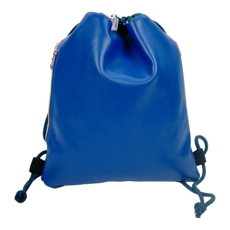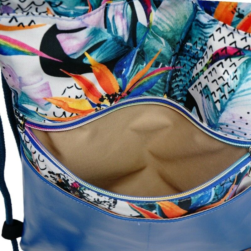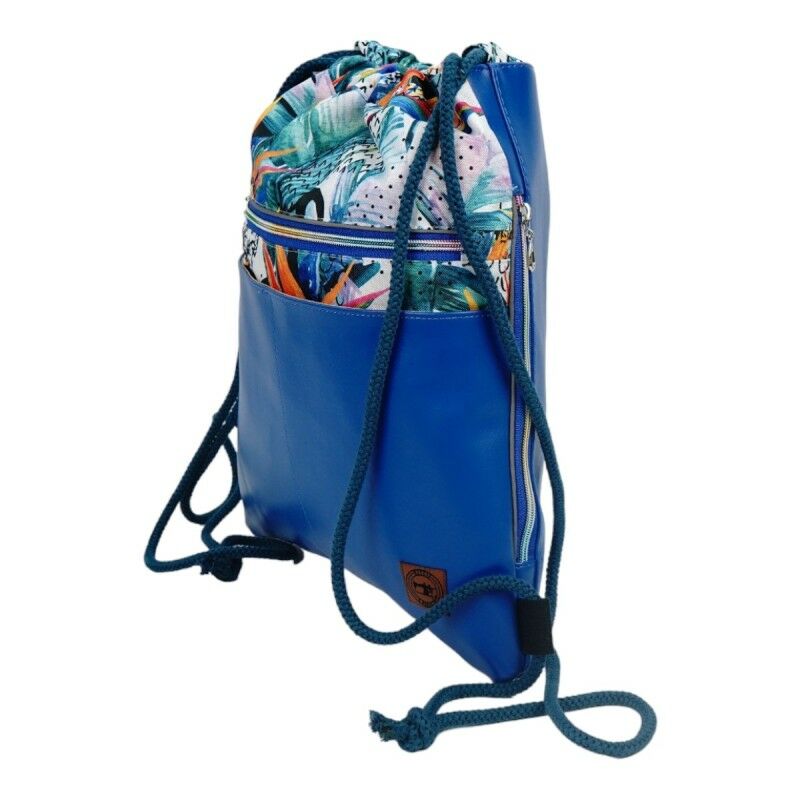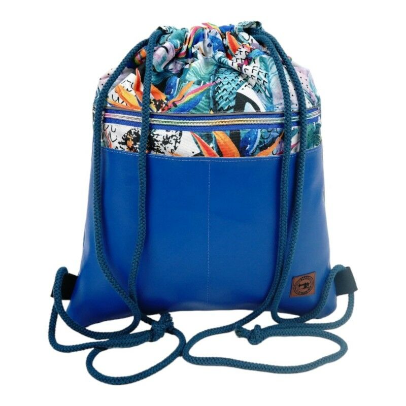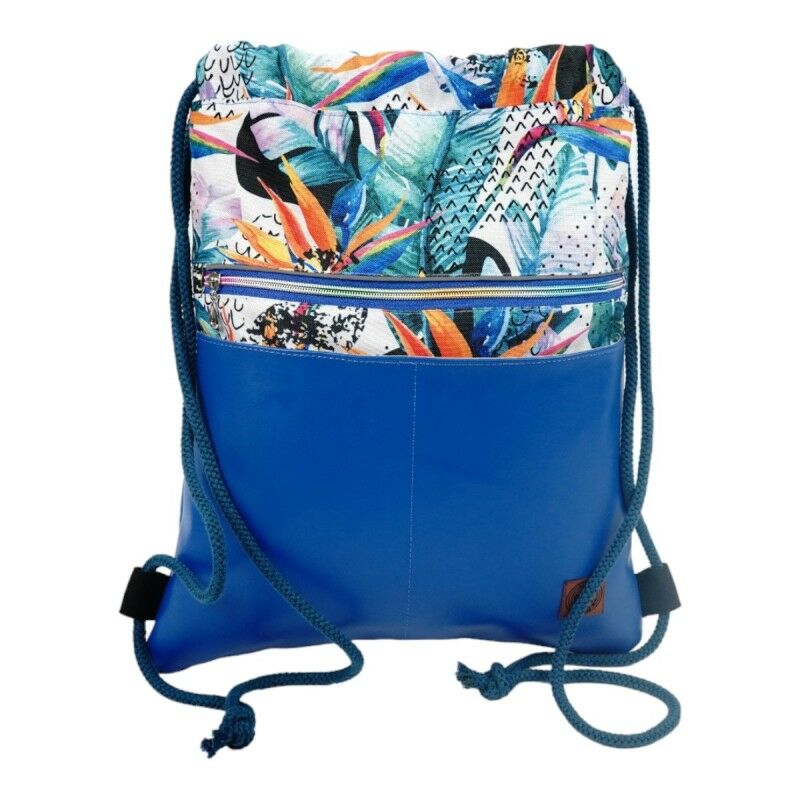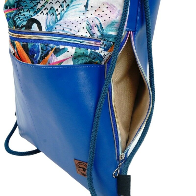 Niebieski Worko-Plecak z Motywem Dżungli – Handmade z Ukrytą Kieszenią na ZamekWyrazisty i praktyczny worko-plecak handmade, który łączy niebieską ekoskórę z tkaniną poliestrową w motyw dżungli. Kolorowy wzór inspirowany naturą przyciąga uwagę i nadaje stylizacjom energii. To idealny model na lato, wakacje i codzienne spacery – łączy wygodę z unikalnym designem.