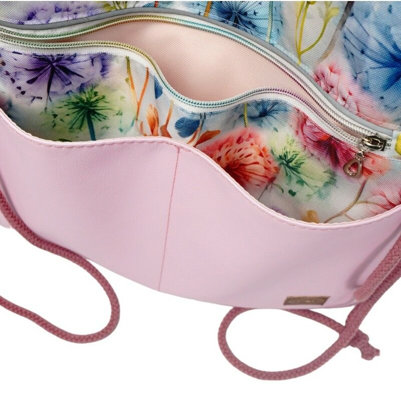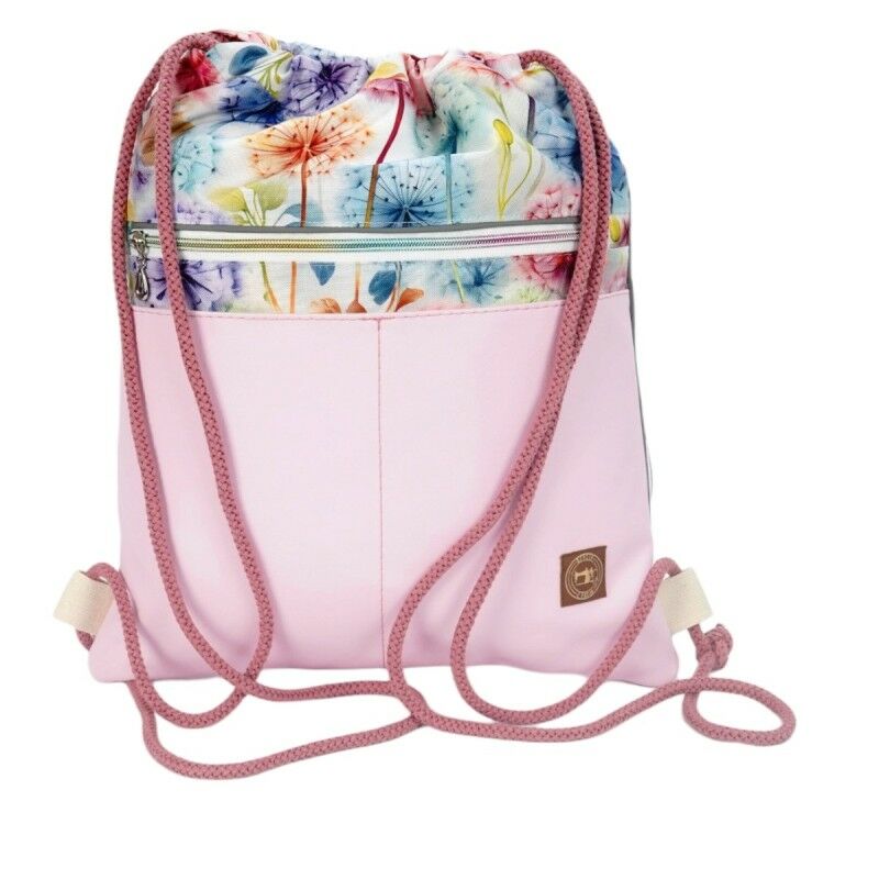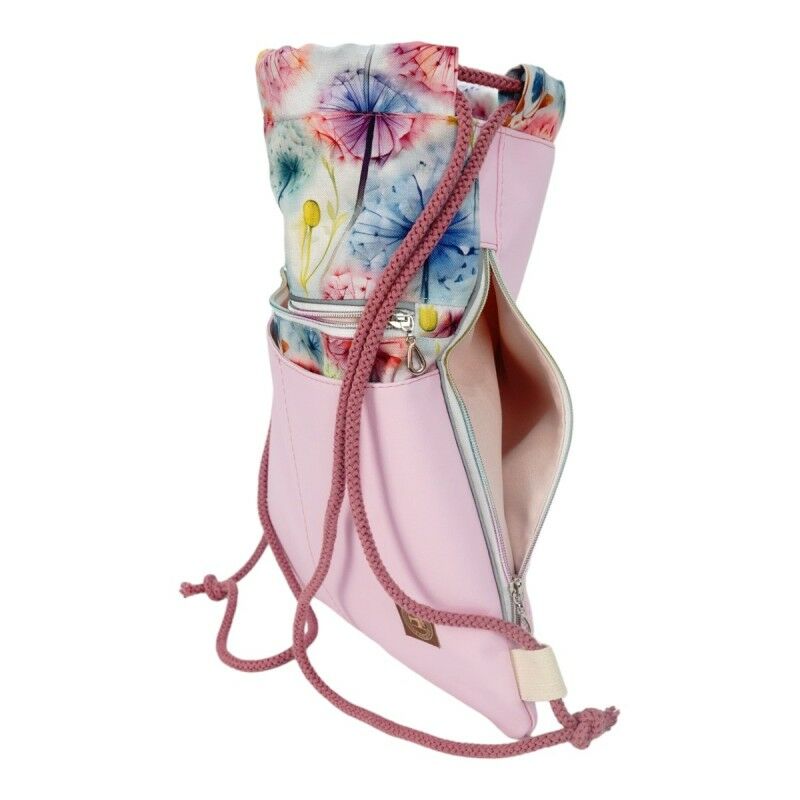 Różowy Worko-Plecak z Motywem Dmuchawców – Handmade z Ukrytą Kieszenią na ZamekSubtelny i lekki worko-plecak handmade w pastelowym różu to propozycja dla miłośniczek delikatnych, kobiecych dodatków. Wykonany z różowej ekoskóry i trwałej tkaniny poliestrowej z motywem kolorowych dmuchawców, łączy funkcjonalność z wyjątkowym wyglądem. To idealny model do letnich stylizacji, spacerów lub codziennego użytku.