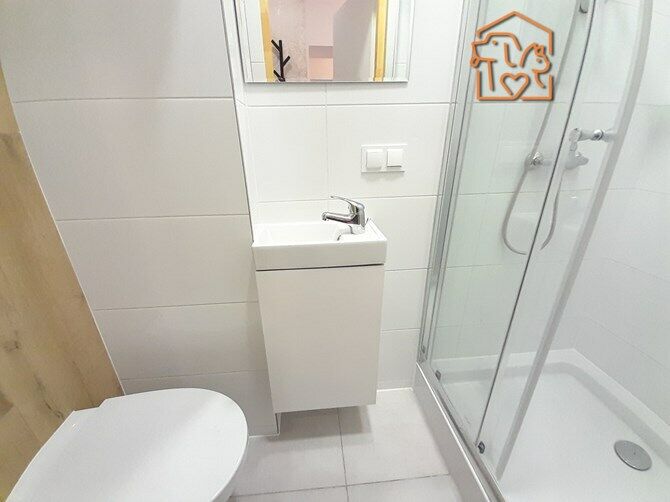 Łazienka z WC: kabina prysznicowa, umywalka, szafka, lustro.